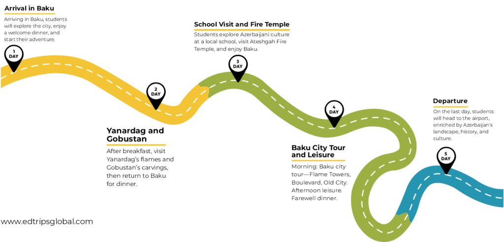 Azerbaijan Discovery – A captivating Educational Journey of 4-night, 5-day to Azerbaijan, where students will explore the rich cultural heritage and breathtaking landscapes of this unique country. The journey begins in Baku, the vibrant capital, where students will experience its modern marvels and historical treasures. A day trip to Yanardag reveals the natural wonder of the “burning mountain,” while the ancient petroglyphs of Gobustan offer a glimpse into prehistoric life. The itinerary also includes a visit to the Fire Temple, showcasing Azerbaijan’s deep-rooted Zoroastrian history. This immersive experience combines educational insights with stunning scenery, providing students with a profound understanding of Azerbaijani culture and geography.