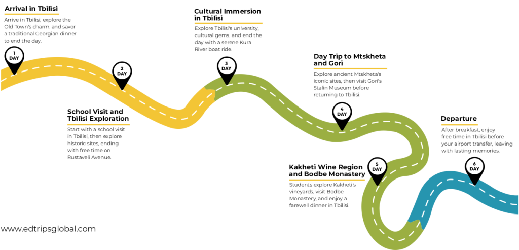 Georgia Discovery – A captivating 5-night, 6-day educational journey to Georgia, where students will delve into the unique blend of Eastern European and Caucasian culture, history, and education. This tour offers a comprehensive experience, combining academic enrichment with cultural immersion. Students will visit a local school in Tbilisi, interact with Georgian peers, and participate in educational activities. A visit to a leading university will allow them to engage in academic discussions and explore future study opportunities. The program also includes exploring the historic sites of Tbilisi, the ancient capital Mtskheta, and the stunning Kazbegi region. By the end of the trip, students will gain insights into Georgia’s education system and its rich cultural heritage, leaving with unforgettable experiences.